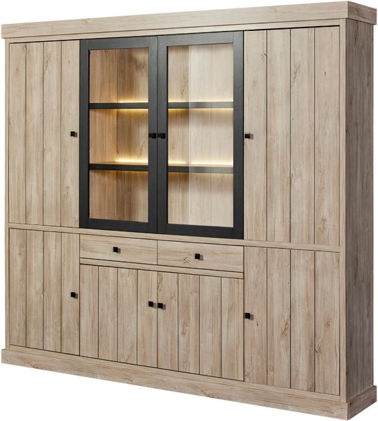 Buffetkast Vince is een praktisch vormgegeven kast in eiken kleur. De kast bestaat uit 2 delen: een onder- en bovenkast. Het onderste gedeelte beschikt over 2 lades en 4 deuren waarachter 8 opbergvakken zitten. Het bovenste gedeelte beschikt over 4 deuren waarvan de middelste 2 uit glas bestaan. Achter deze deuren zitten nog eens 9 opbergvakken. Alle lades en deuren openen met zwarte knoppen. Ten slotte is deze kast voorzien van LED-verlichting.